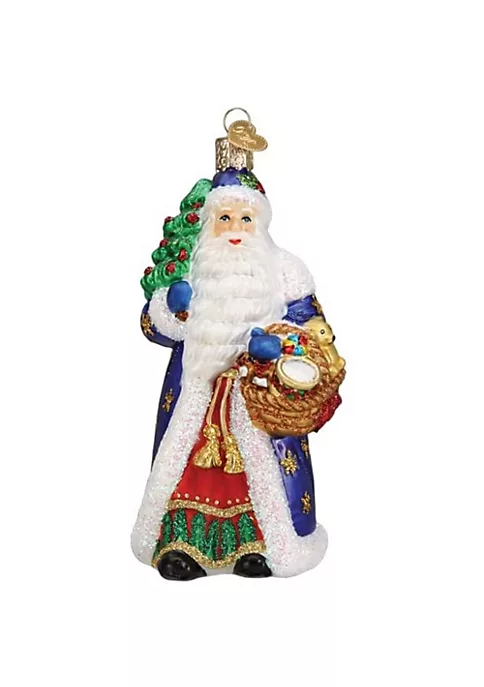 features St. Nicholas in a blue coat and red robe carrying a tree and gift