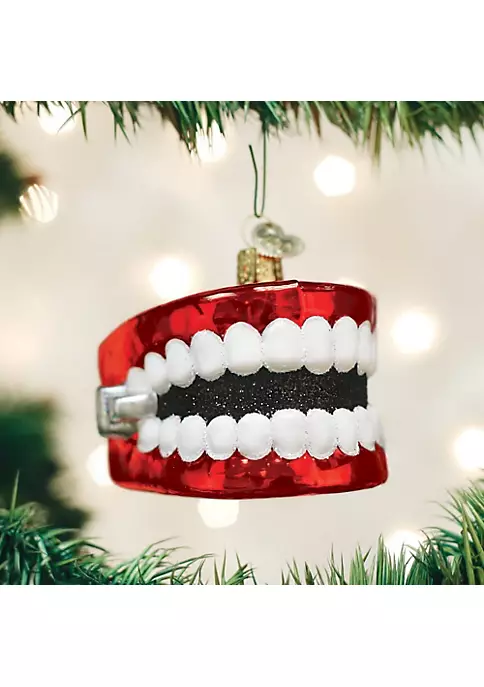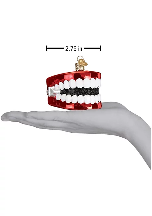 Wind up teeth are a fun novelty toy. The toy has adorned many toy boxes and even a few desks as gifts for years. The mechanical toy is wound in the back and then it chatters. The toy was first designed by a man to mock his mother-in-law and her dentures. All sides are nicely detailed. It is made of blown glass, delicately hand-painted and has sparkling glittered accents.