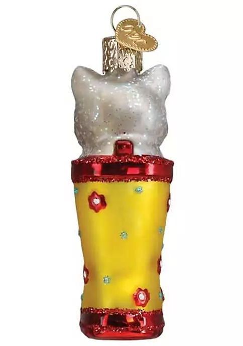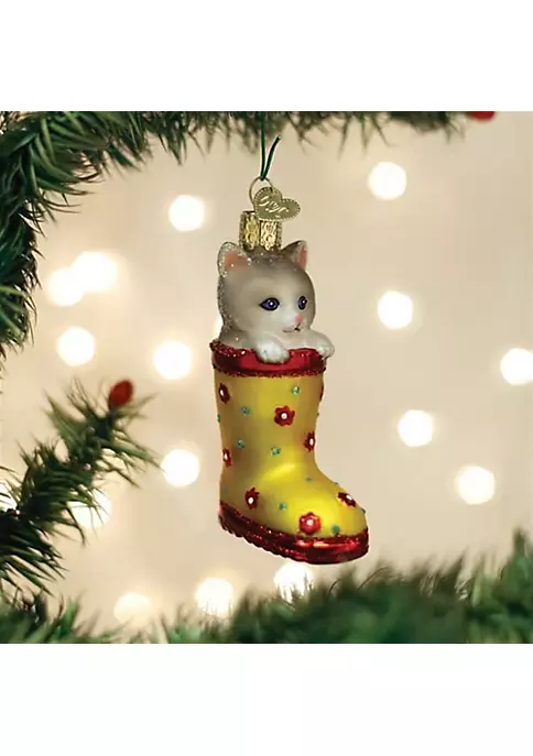 Is there anything cuter than a curious kitten curiously playing and exploring the world around them? This kitten in a rainboot ornament is sure to capture the warm, cuddly feelings of the holidays. This ornament is made from mouth-blown glass and was hand-painted to bring you a high-quality ornament. Great gift for family and friends!