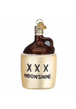 Whether you know this beverage as white lightening, fire water, mountain dew, hooch, or so many other names including simply moonshine. For many this ornament will bring back old or even more recent memories of this very potent liquid. The ornament depicts a dark brown top stoneware jug from prohibition days with the well known triple x to designate it was the results of completing all three steps of the distilling process plus “Moonshine” in dark brown lettering. Common comments about this often up to 190% proof alcohol beverage (190 proof = 95% alcohol) was that it will “knock your socks off” or “put hair on your chest” and there was good reason for that. This is an item to our camping and hunting themes as it was something to keep you warm while in the outdoors too. All sides of this ornament are nicely detailed. It is made of blown glass, delicately hand-painted and has sparkly glittered accents.