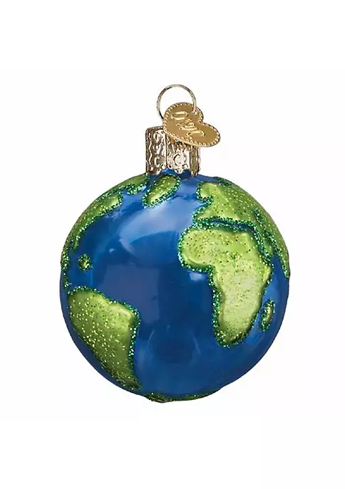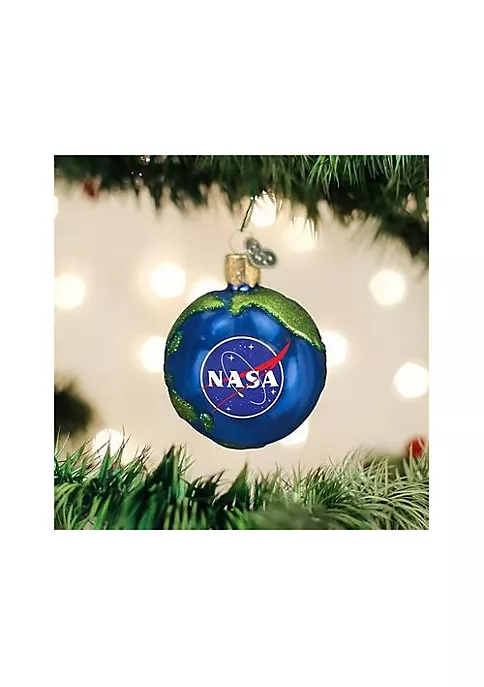 World Globe with Nasa insignia Christmas ornament features an ocean blue globe with raised green areas for land masses plus one side has “NASA” in the common blue emblem. All sides are nicely details. It is made of blown glass, delicately hand-painted and has sparkly glittered accents.ย