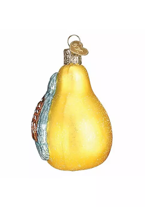 This beautifully crafted ornament is features a yellow pear with a raised partridge sitting on a branch design. It makes a wonderful combination of fruit and Christmas carol ornament. All sides are nicely detailed. It is made of blown glass, delicately hand-painted and has sparkling glitter accents.