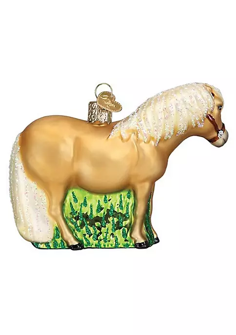Β This ornament does a great job of depicting the ever popular and kids favorite Shetland pony, a very robust small horse used as a work horse or kept as a pet. It has palomino coat coloring (gold with white mane and tail), a brown halter on the head and even has the common large belly and buttocks. The white mane and tail have sparkling glitter accents and it includes tall grass designs between the legs. All sides are nicely detailed. It is made of blown glass, delicately hand-painted and hand-glittered. Beautifully designed, detailed with glitter, hand-painted, but most of all; made with love!Β